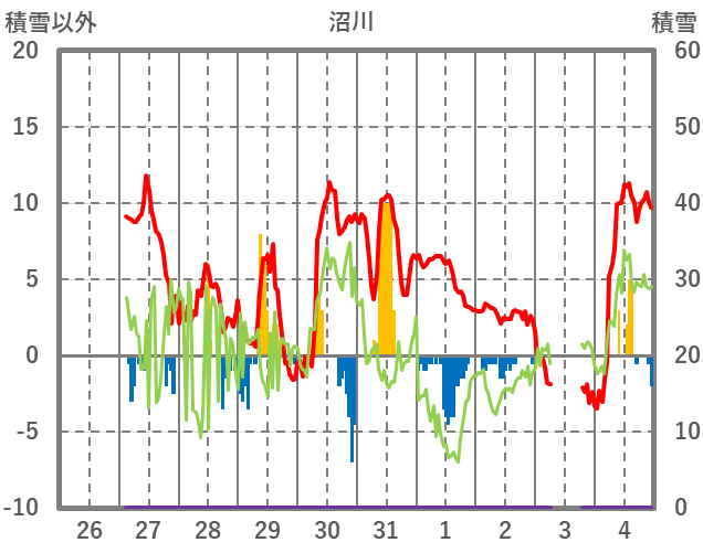 | 日 | 時 | 気温 | 降水 | 風向/風速 | 日照 | 積雪 | 降雪 |