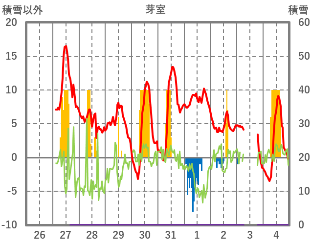 | 日 | 時 | 気温 | 降水 | 風向/風速 | 日照 | 積雪 | 降雪 |