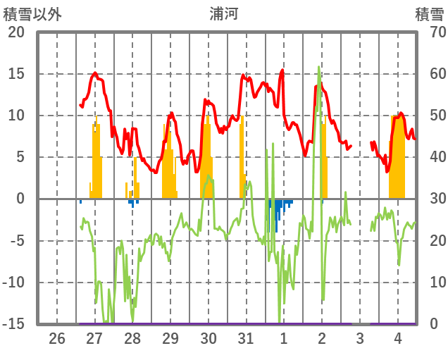 | 日 | 時 | 気温 | 降水 | 風向/風速 | 日照 | 積雪 | 降雪 |