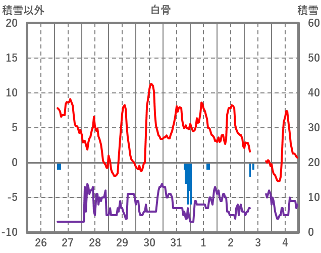| 日 | 時 | 気温 | 降水 | 風向/風速 | 日照 | 積雪 | 降雪 |
