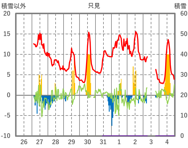 | 日 | 時 | 気温 | 降水 | 風向/風速 | 日照 | 積雪 | 降雪 |