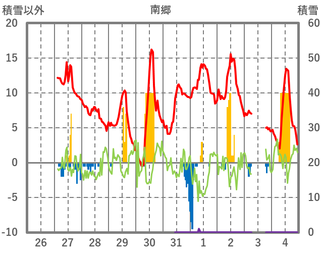| 日 | 時 | 気温 | 降水 | 風向/風速 | 日照 | 積雪 | 降雪 |