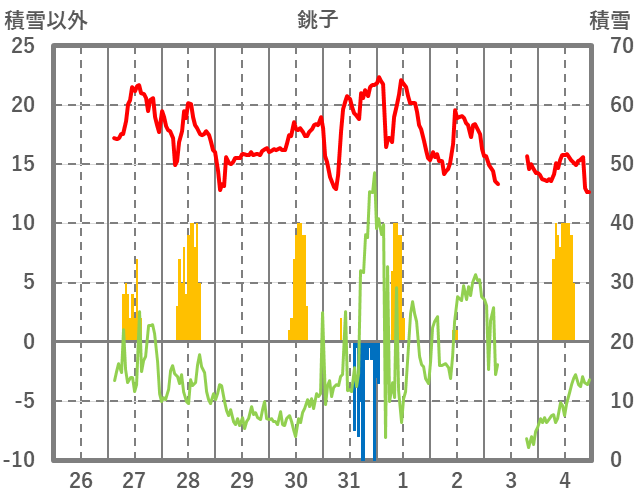 | 日 | 時 | 気温 | 降水 | 風向/風速 | 日照 | 積雪 | 降雪 |