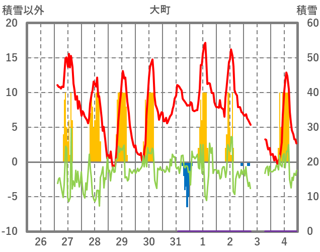 | 日 | 時 | 気温 | 降水 | 風向/風速 | 日照 | 積雪 | 降雪 |