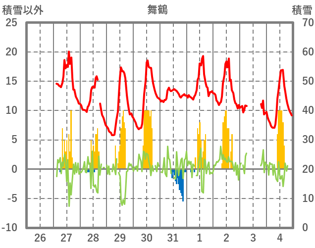 | 日 | 時 | 気温 | 降水 | 風向/風速 | 日照 | 積雪 | 降雪 |