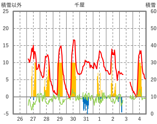 | 日 | 時 | 気温 | 降水 | 風向/風速 | 日照 | 積雪 | 降雪 |