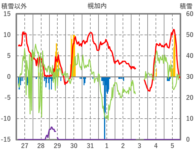 | 日 | 時 | 気温 | 降水 | 風向/風速 | 日照 | 積雪 | 降雪 |