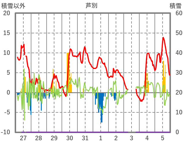 | 日 | 時 | 気温 | 降水 | 風向/風速 | 日照 | 積雪 | 降雪 |