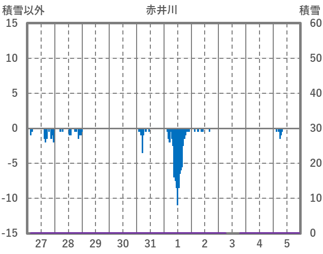 | 日 | 時 | 気温 | 降水 | 風向/風速 | 日照 | 積雪 | 降雪 |