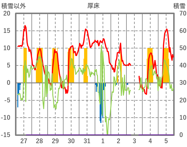 | 日 | 時 | 気温 | 降水 | 風向/風速 | 日照 | 積雪 | 降雪 |