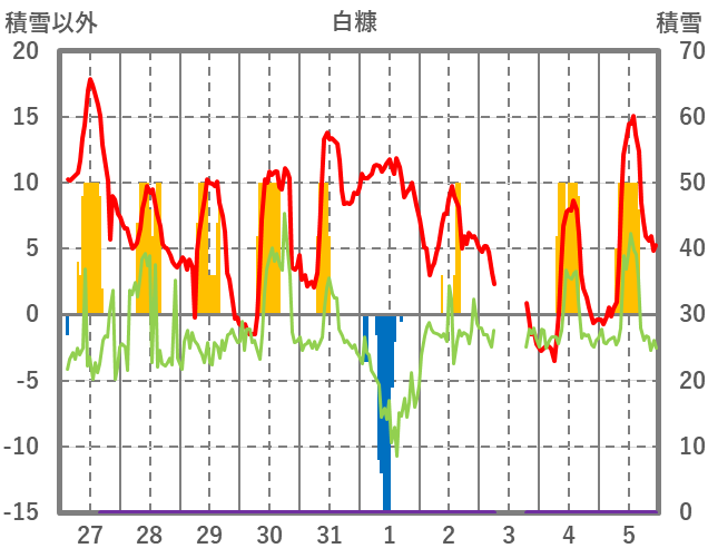 | 日 | 時 | 気温 | 降水 | 風向/風速 | 日照 | 積雪 | 降雪 |