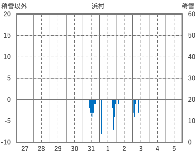 | 日 | 時 | 気温 | 降水 | 風向/風速 | 日照 | 積雪 | 降雪 |