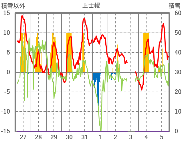 | 日 | 時 | 気温 | 降水 | 風向/風速 | 日照 | 積雪 | 降雪 |
