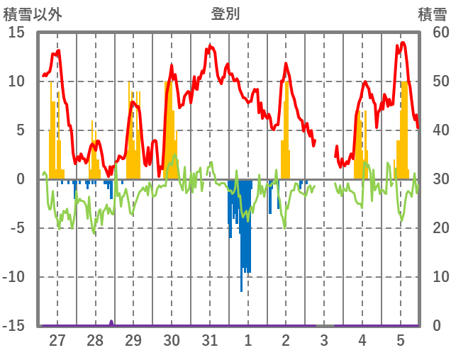 | 日 | 時 | 気温 | 降水 | 風向/風速 | 日照 | 積雪 | 降雪 |