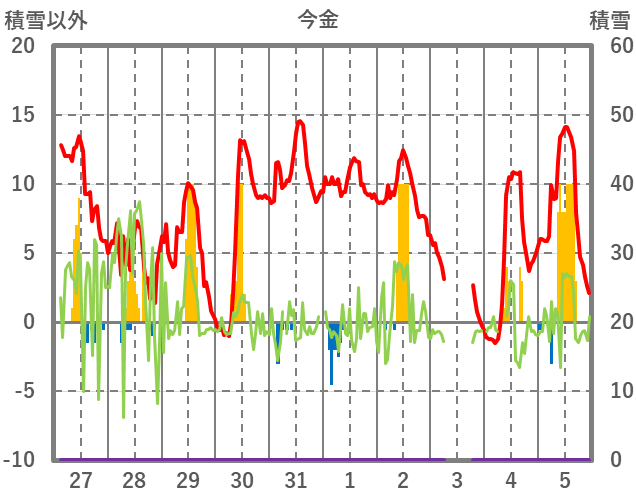 | 日 | 時 | 気温 | 降水 | 風向/風速 | 日照 | 積雪 | 降雪 |