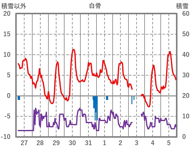 | 日 | 時 | 気温 | 降水 | 風向/風速 | 日照 | 積雪 | 降雪 |