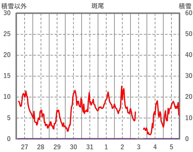 | 日 | 時 | 気温 | 降水 | 風向/風速 | 日照 | 積雪 | 降雪 |