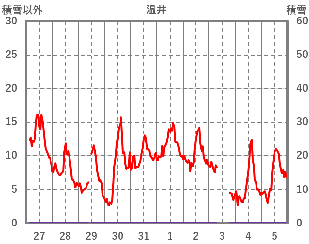 | 日 | 時 | 気温 | 降水 | 風向/風速 | 日照 | 積雪 | 降雪 |