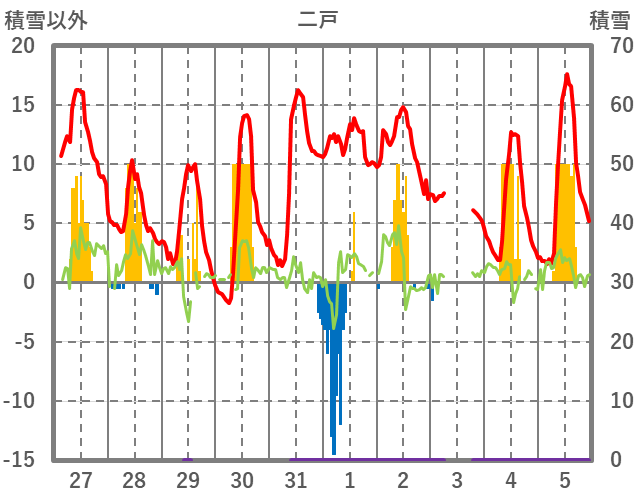 | 日 | 時 | 気温 | 降水 | 風向/風速 | 日照 | 積雪 | 降雪 |