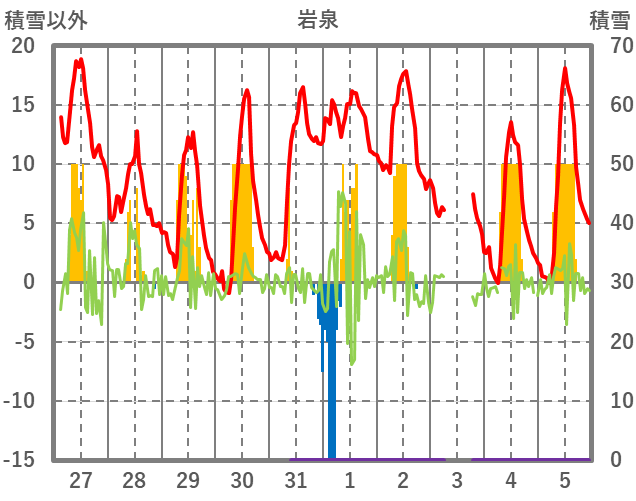 | 日 | 時 | 気温 | 降水 | 風向/風速 | 日照 | 積雪 | 降雪 |