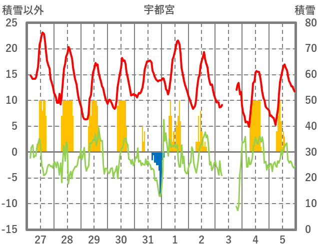 | 日 | 時 | 気温 | 降水 | 風向/風速 | 日照 | 積雪 | 降雪 |