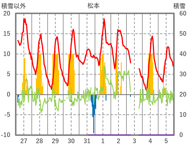 | 日 | 時 | 気温 | 降水 | 風向/風速 | 日照 | 積雪 | 降雪 |