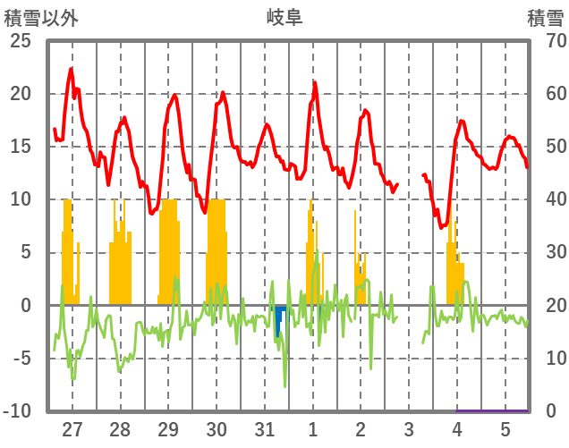 | 日 | 時 | 気温 | 降水 | 風向/風速 | 日照 | 積雪 | 降雪 |