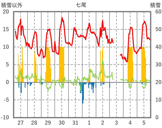 | 日 | 時 | 気温 | 降水 | 風向/風速 | 日照 | 積雪 | 降雪 |