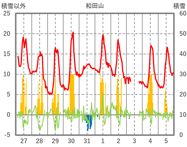| 日 | 時 | 気温 | 降水 | 風向/風速 | 日照 | 積雪 | 降雪 |