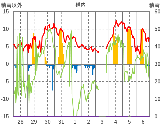 | 日 | 時 | 気温 | 降水 | 風向/風速 | 日照 | 積雪 | 降雪 |