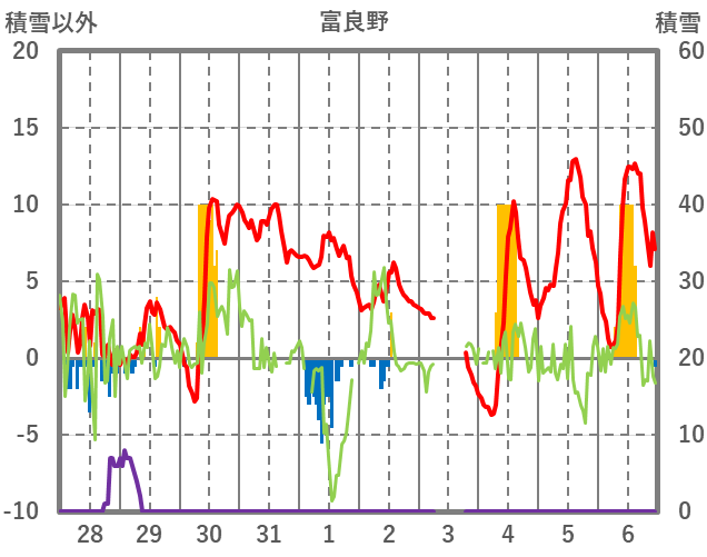 | 日 | 時 | 気温 | 降水 | 風向/風速 | 日照 | 積雪 | 降雪 |