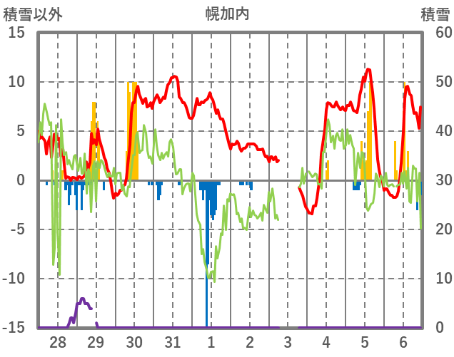 | 日 | 時 | 気温 | 降水 | 風向/風速 | 日照 | 積雪 | 降雪 |