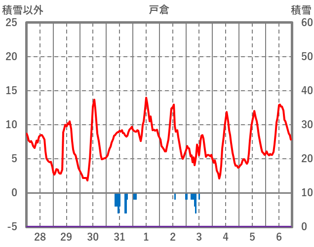 | 日 | 時 | 気温 | 降水 | 風向/風速 | 日照 | 積雪 | 降雪 |