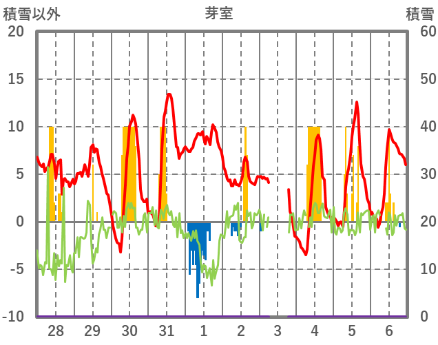 | 日 | 時 | 気温 | 降水 | 風向/風速 | 日照 | 積雪 | 降雪 |