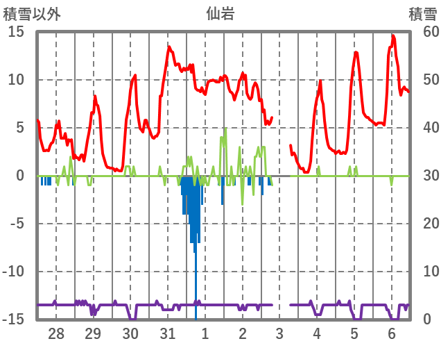| 日 | 時 | 気温 | 降水 | 風向/風速 | 日照 | 積雪 | 降雪 |