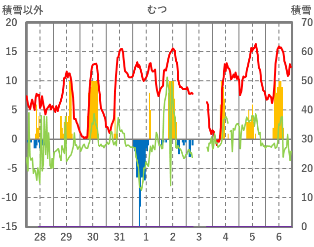 | 日 | 時 | 気温 | 降水 | 風向/風速 | 日照 | 積雪 | 降雪 |