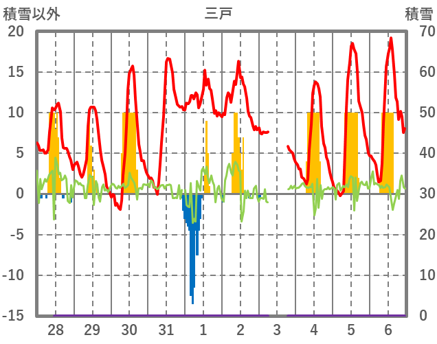 | 日 | 時 | 気温 | 降水 | 風向/風速 | 日照 | 積雪 | 降雪 |