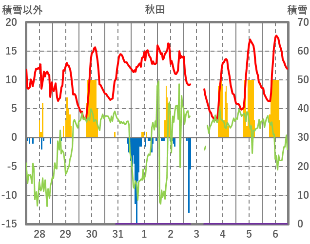 | 日 | 時 | 気温 | 降水 | 風向/風速 | 日照 | 積雪 | 降雪 |