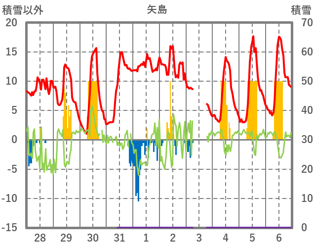 | 日 | 時 | 気温 | 降水 | 風向/風速 | 日照 | 積雪 | 降雪 |