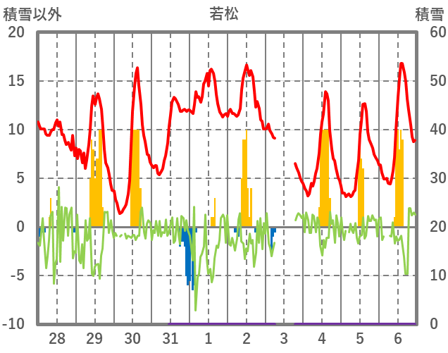 | 日 | 時 | 気温 | 降水 | 風向/風速 | 日照 | 積雪 | 降雪 |