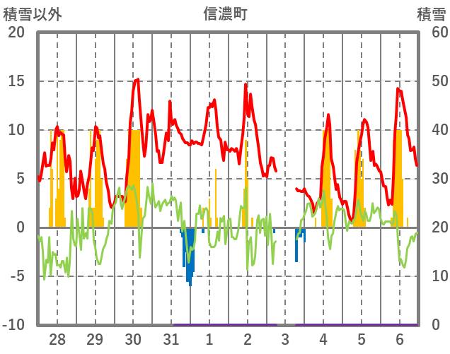 | 日 | 時 | 気温 | 降水 | 風向/風速 | 日照 | 積雪 | 降雪 |