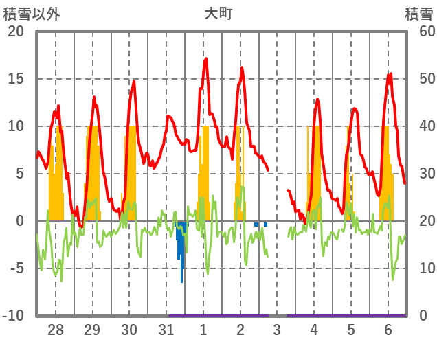 | 日 | 時 | 気温 | 降水 | 風向/風速 | 日照 | 積雪 | 降雪 |