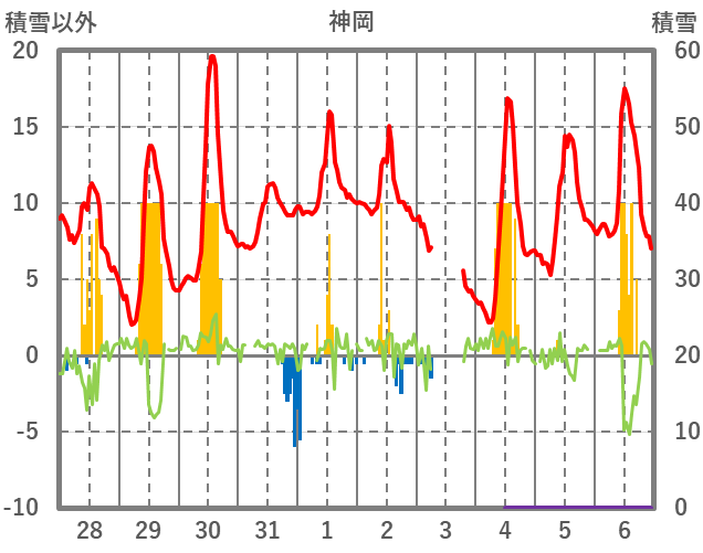 | 日 | 時 | 気温 | 降水 | 風向/風速 | 日照 | 積雪 | 降雪 |