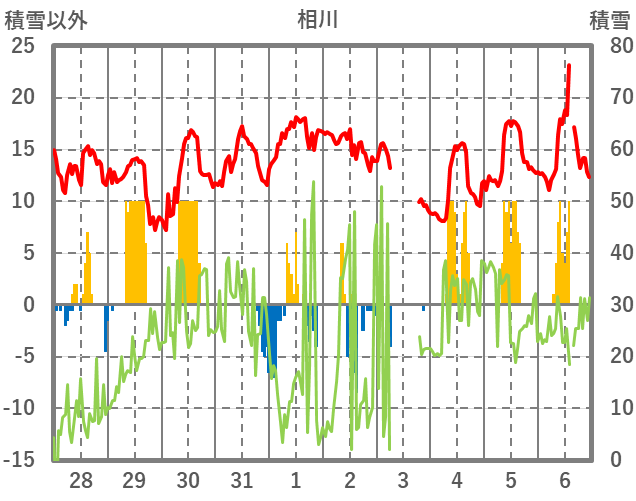 | 日 | 時 | 気温 | 降水 | 風向/風速 | 日照 | 積雪 | 降雪 |