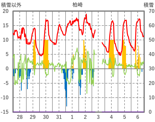 | 日 | 時 | 気温 | 降水 | 風向/風速 | 日照 | 積雪 | 降雪 |