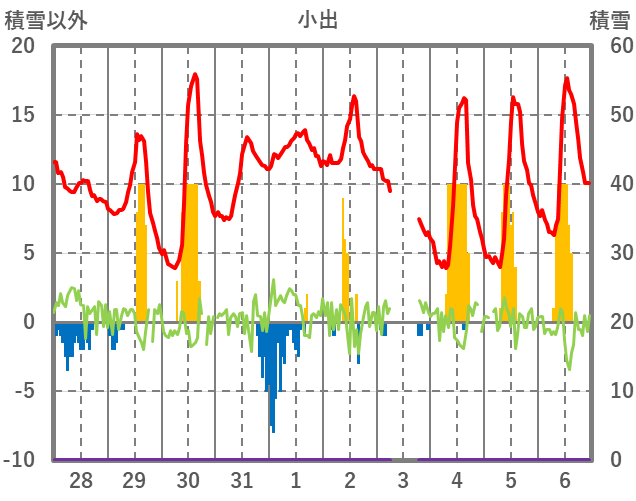 | 日 | 時 | 気温 | 降水 | 風向/風速 | 日照 | 積雪 | 降雪 |