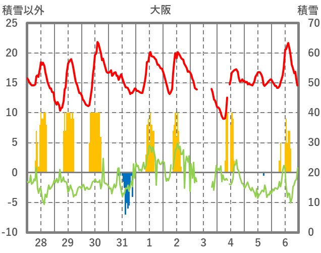 | 日 | 時 | 気温 | 降水 | 風向/風速 | 日照 | 積雪 | 降雪 |