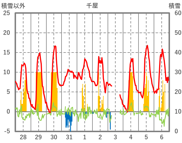 | 日 | 時 | 気温 | 降水 | 風向/風速 | 日照 | 積雪 | 降雪 |