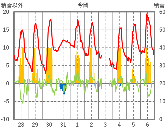 | 日 | 時 | 気温 | 降水 | 風向/風速 | 日照 | 積雪 | 降雪 |