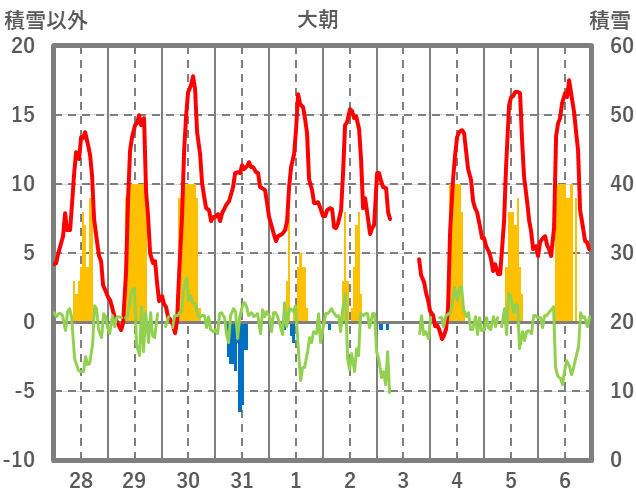 | 日 | 時 | 気温 | 降水 | 風向/風速 | 日照 | 積雪 | 降雪 |